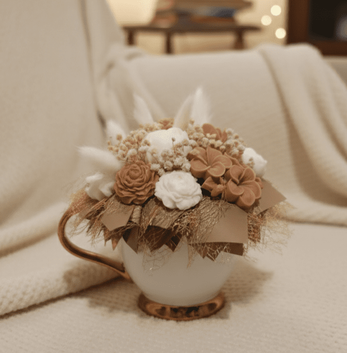 Bouquet de fleurs de cire dans une jolie tasse Alice blanche